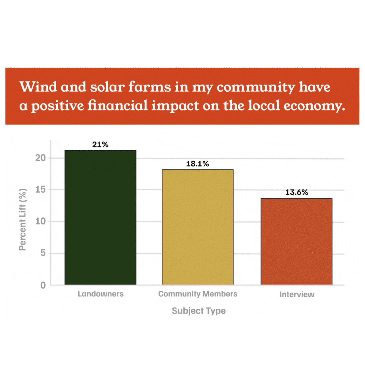 The Good Data Lab conducted over 20 studies to measure the impact of our renewables program alone. A series of randomized control trials testing Good Power-developed creator and testimonial messages found demonstrable, consistent increases in perceptions of renewable energy for those in high priority zip codes for development. These include an average 13% increase in perceptions that wind and solar boosts the local economy and a 10% increase in support for building renewable energy in their communities. A follow-up field study demonstrated these effects are nearly twice as high among those who began the study with no opinion about renewables.
